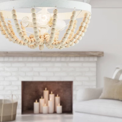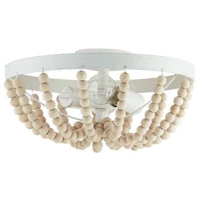 Light your interiors while adding some glam vintage Bohemian vibes to the 15″ Delilah Boho Semi-Flush Mount Ceiling Fixture from River of Goods. Combining a brushed white metal frame and charming wooden bead accents, this semi-flush mount hanging lamp makes a great choice for overhead lighting in the center of your living room, above your dining table or even in a hallway. The light hardwires into your ceiling for a clean, integrated look, and the mixed materials combining matte metal and beige wooden beads bring coastal-inspired style to your decor. This ceiling-mount lamp uses two E26 60-watt maximum or compatible LED bulbs, and is designed for indoor use only.