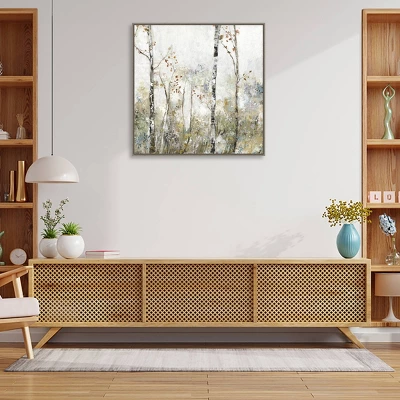 ART DESCRIPTION: A series of birch saplings pop out of dense underbrush, shooting their little leaves into the morning mist. Scratches and impressions of bushes and plants fill out the bottom of this painting, but a white haze obscures all but the sturdiest limbs at the top. This Amanti Art canvas art print was created by Allison Pearce and printed by Amanti Art in Madison WI. The canvas is stretched by hand and finished with a float frame. Individually made using traditional custom framing techniques, it has the quality you would expect from your local frame shop. Because of our attention to detail and focus on artistry, architects, interior designers, and homeowners alike choose this framed canvas artwork to create beautiful living spaces.