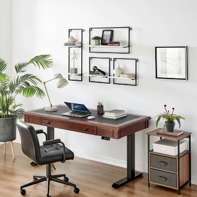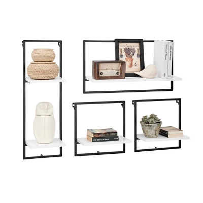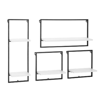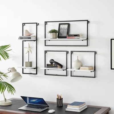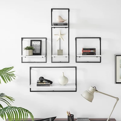 The Danya B. 4-Tier Wall Shelf Unit offers 4 sturdy, modern shelves made from MDF and metal shelving. This industrial yet classy wall mounted horizontal frame unit features four offset shelves that offer ample storage and display space for a wide variety of decor such as books, plants, art, awards, and more. With a metal frame outlining the offset contrasting wood shelves, this shelving displays your items in a unique and urban window frame footprint. One large platform shelf allows for traditional bookshelf usage or organization of larger items, while two medium and two small shelves encourage display of prized decor or frequently used items. The unique set of shelves can be arranged in different configurations for personalized display of your favorite décor. Available in two contrasting color combinations, this hanging bookshelf is perfect for adding storage to the walls of every room in your home without compromising your existing aesthetic and style.
