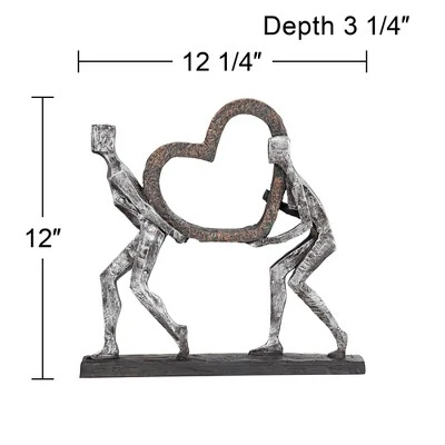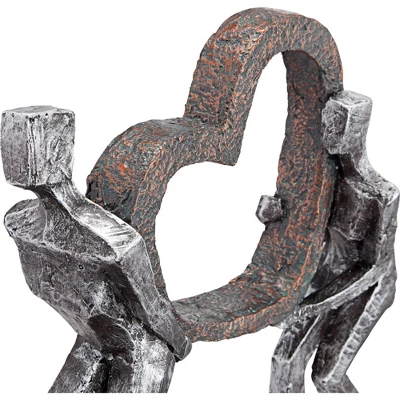 Perfect for accenting a contemporary space, this artistic resin figurine depicts two abstract human shapes carrying a heart, The heart comes in a bronze finish, while the human figures are in a two-tone silver finish. Rectangular base is in a dark bronze finish.
