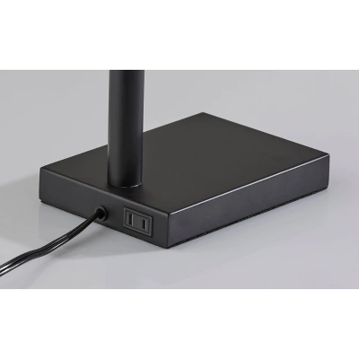 With a clean, minimal design and a simple color palette, the 26.5″ Flora table lamp exudes modern style. It features a black metal rectangular base measuring 5.5″ by 8″. The black finish continues up the stem before transitioning to an antique brass finish leading to the square, off-white textured fabric shade that softly distills the light. For convenient access to AC power on your table or desk, the base includes an outlet subtly located on the back. The 60W bulb (not included) is operated by a rotary switch located on the socket and features a 5′ clear cord. The Flora table lamp is also available with a black and brushed steel finish and light taupe textured fabric shade.