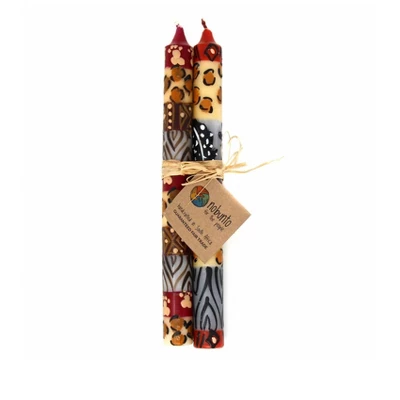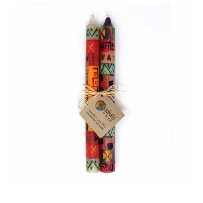 These globally-inspired hand-painted candles are small works of art. Crafted by artisans in South Africa, each candle is hand-poured and then individually hand-painted. Each design name is derived from a special African word that is brought to life through the color and patterns which reflect the culture and influences of South Africa. The style images pictured illustrate the general design, but note that each candle is one of a kind. A truly unique and beautiful gift for hostesses, housewarming, wedding, anniversary, and more that make a striking addition to every home and a beautiful conversation piece! Product Features: Design Meaning: In the Zulu language, Sinifisela Ukhisimusi Omuhle – Merry Christmas is what the Zulu want. Christmas in southern Africa is often spent cheerfully and happily in summer weather on the beach. Set of 2 Gift-packaged Dinner Tapers. Candles measure approximately 9-inches tall. Unscented, high-quality, fully-refined paraffin wax from Germany. Non-toxic color pigments and natural wicks. Individually hand-painted. Designs will have differences, but will be consistent in colors and icons that reflect the style. Creates a calm ambiance that transforms any space into a personal sanctuary. Burn time averages 10 hours. High melting point of 58- 60. Use care when burning candles. Do not leave a burning candle unattended; snuff out flame when done burning; do not move burning candle; always use a candle holder when burning. The Story Behind the Art: Each candle is hand poured and hand painted by South African artisans with years of experience. After the candles are poured, they are handed off to the special background painters, who paint the entire wax candle with a base color that sets the tone for the design work that comes next. Masterful artists then paint the designs on each piece. It is truly exciting to watch the lightening-fast strokes of the paintbrushes transform what was molten wax into gorgeously colorful, individualized works of art!