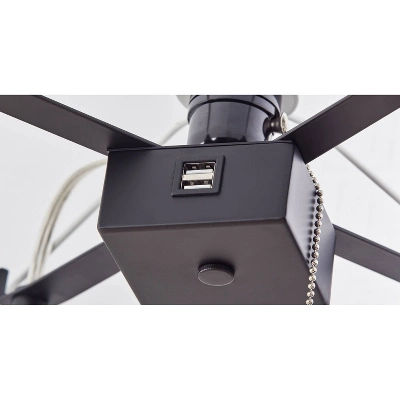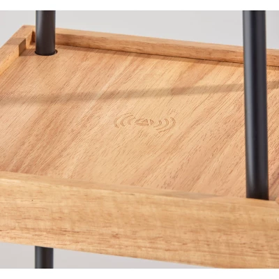 The three-tiered Henry AdessoCharge shelf floor lamp is a versatile piece that offers the perfect solution for lighting, storage, and wireless charging. Supported by slender, black metal poles in a tapering square design, the lamp includes three natural wood shelves and a white linen drum shade for a contemporary, mixed material look. The three shelves are of varying sizes and clearance heights, ideal for displaying your favorite books and accent pieces. Built flush into the top shelf is a wireless charging pad with Qi inductive charging technology, allowing you to conveniently charge compatible devices by simply placing your device on the pad for clean, cord-free charging. The AdessoCharge pad supports 5W charging on contact with the charging pad, which gets your phone from a battery charge of 0% to 100% in just 4-5 hours, depending on your phone model. For added functionality, dual USB outlets are located below the light socket, nestled behind the lampshade, allowing you to charge additional devices. The wireless pad, USB outlets, and light from a 150W bulb can all be used simultaneously. The light is easily turned on or off with a pull chain switch, while the lamp is powered by a 5′ clear cord.