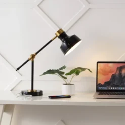 19.5″ Bedside Power Outlet Base Metal Table Desk Lamp In White Fabric Shade – Creekwood Home