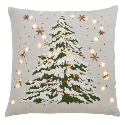A truly unique accent and fun conversation piece for your holiday décor collection! The design features a centered Christmas tree using traditional holiday colors and LED lights sprinkled about on the front side. Pair with other, solid color throw pillows to help it stand out. Lights are battery powered; not included.