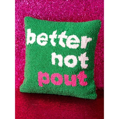 Add a festive touch to your home decor with this charming pillow from Shiraleah. The “Better Not Pout” pillow features the text “Better Not Pout” in bold pink and white letters and a festive green background making it a fun and playful addition to your holiday decor . This pillow measures 14” long and 14” wide making it the perfect size to cuddle up to. Made from cotton and filled with a removable polyfill insert, this pillow is the perfect addition to your winter décor.