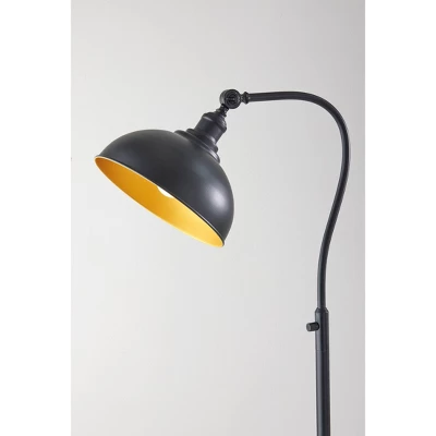 With its clean style lines and monochromatic metal construction, the 56.5″ tall Wallace floor lamp is a perfect complement to industrial décor. The round black metal shade has a clean silhouette that leaves the bulb exposed, making a vintage Edison bulb (not included) an eye-catching choice. Complementing the exterior’s black metal, the interior of the shade features an accent color of gold finish that imbues the light from a 100W bulb with a warm glow. The base of the lampshade also features an articulation point, allowing you to direct the light wherever it’s needed. A graceful arcing stem connects the shade to a tall narrow pole with a rotary switch to easily turn the lamp on and off. Complete your décor with the coordinating Wallace desk lamp, wall lamp, and pendant light.