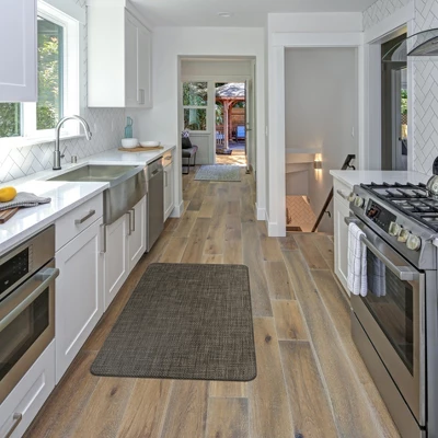 - Superior Comfort & Durability. Designed with resilience against everyday wear-and-tear, this mat is kid and pet friendly and perfect for high traffic areas of your home such as, kitchen, entryway, nursery, craft room, laundry room, standing desk area, kitchen sink and home office.